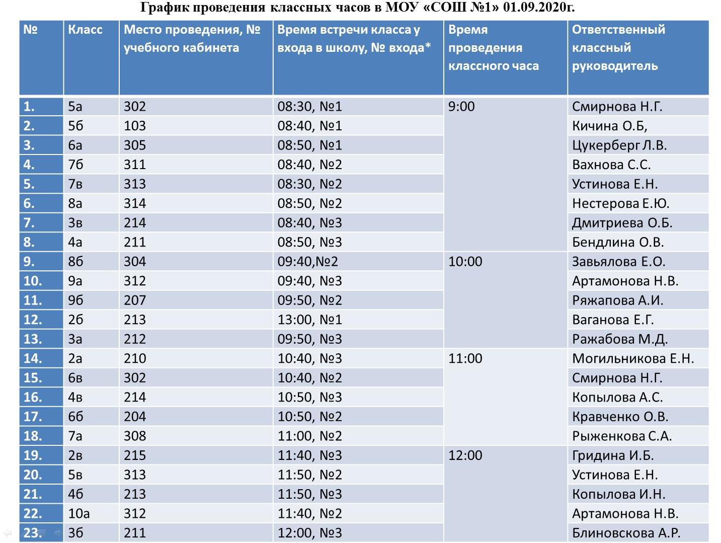 График проведения классных часов в МОУ «СОШ №1» 1 сентября 2020г.: