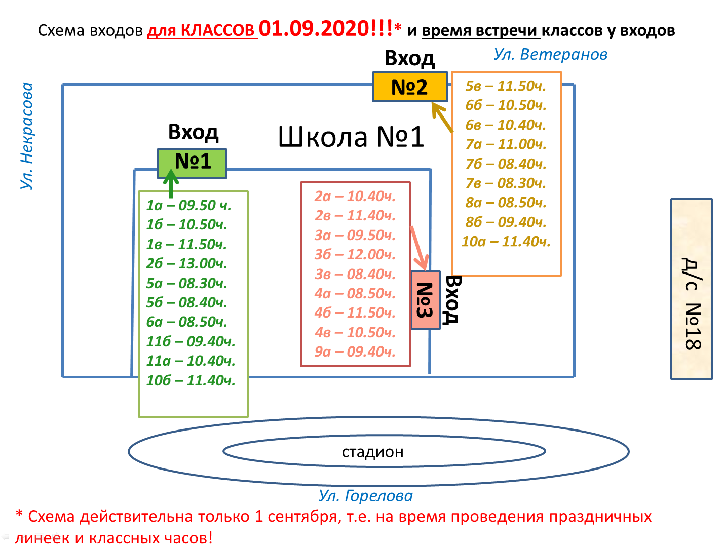 посвященные празднику 1 сентября. Для остальных учащихся будут проведены тематические классные часы. В связи с эпидемиологической ситуацией и рекомендациями Роспотребнадзора с 1 сентября 2020г. будут изменены организационные моменты в режиме работы школы. Для избежания скопления людей вход в здание школы будет организован через запасные входы: вход №1 — основной вход, вход №2 — вход со стороны ул. Ветеранов, вход №3 находится во дворе школы с правой стороны.