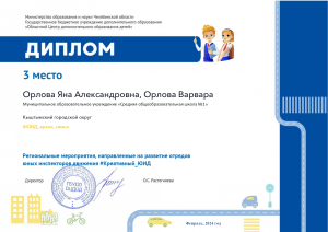 Наши юные инспектора дорожного движения – отряд ЮИД «Дорожный дозор» 1в класса (классный руководитель Елизавета Вячеславовна Шестакова) приняли участие в областном мероприятии «Креативный ЮИД». Варвара Орлова и ее мама Яна Александровна стали призерами этого мероприятия.
